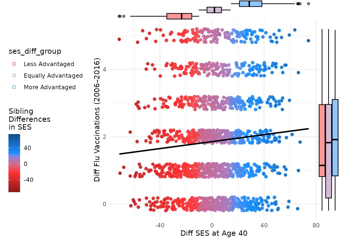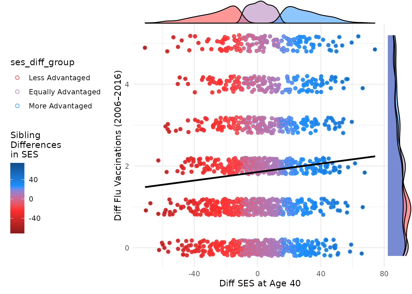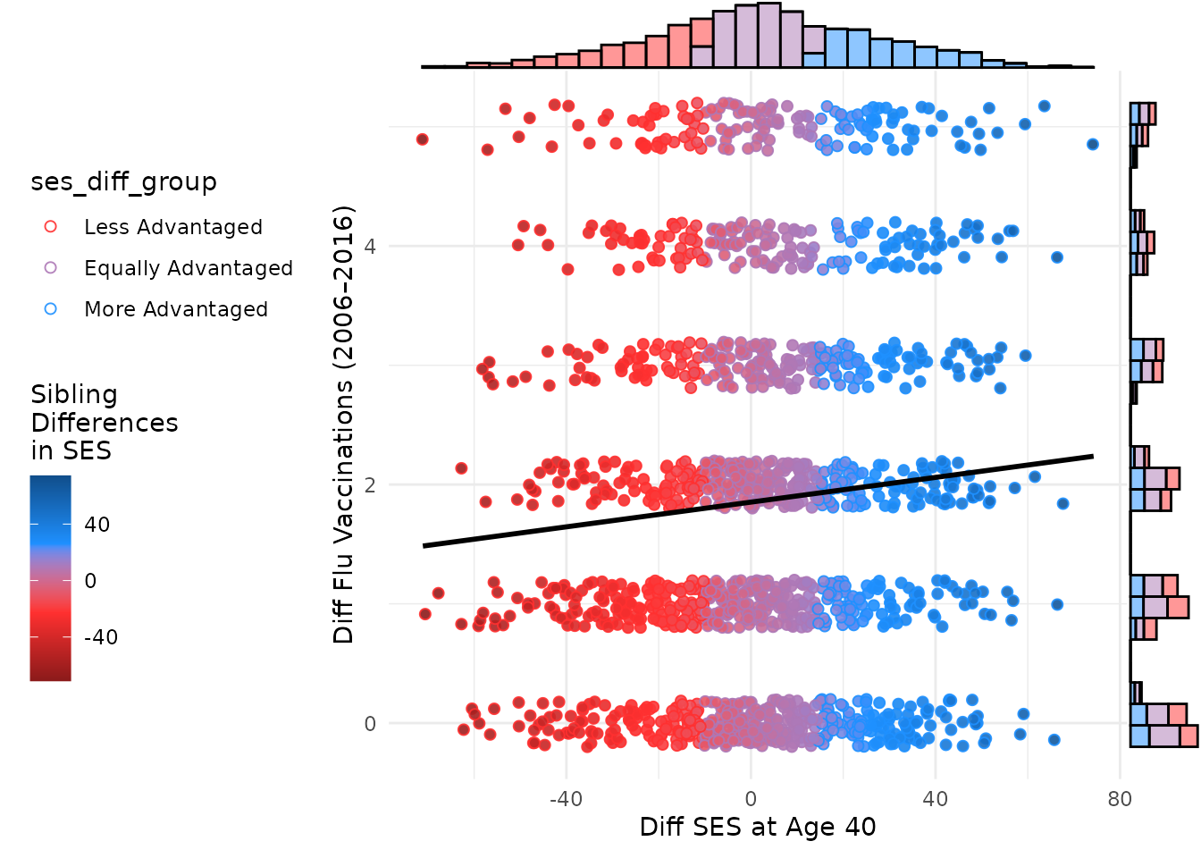 This plot compares differences in SES at age 40 to differences in flu vaccinations, with points colored by SES difference. Marginal plots are omitted for simplicity but can be added using the same structure.