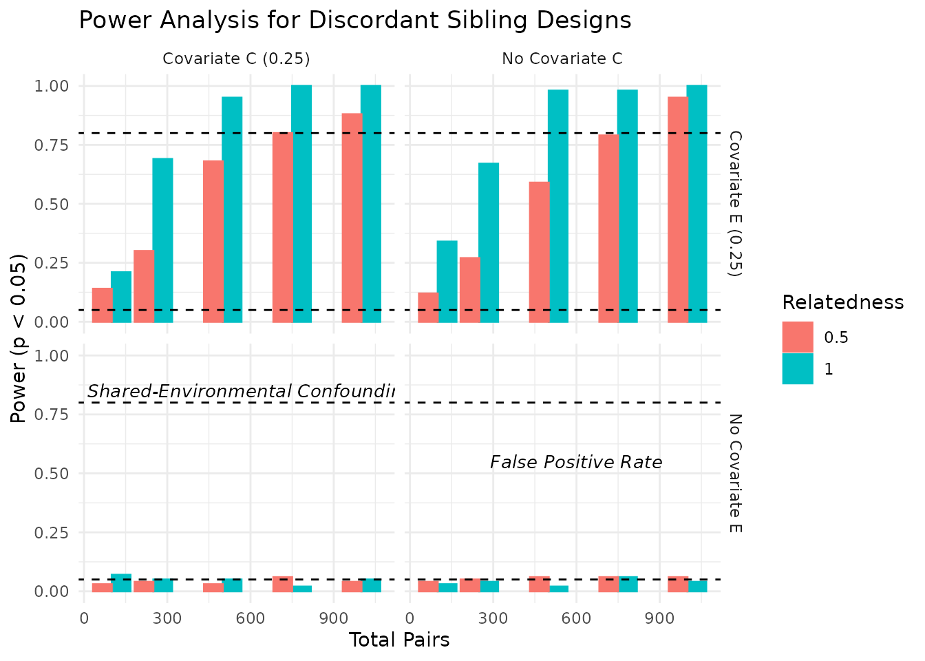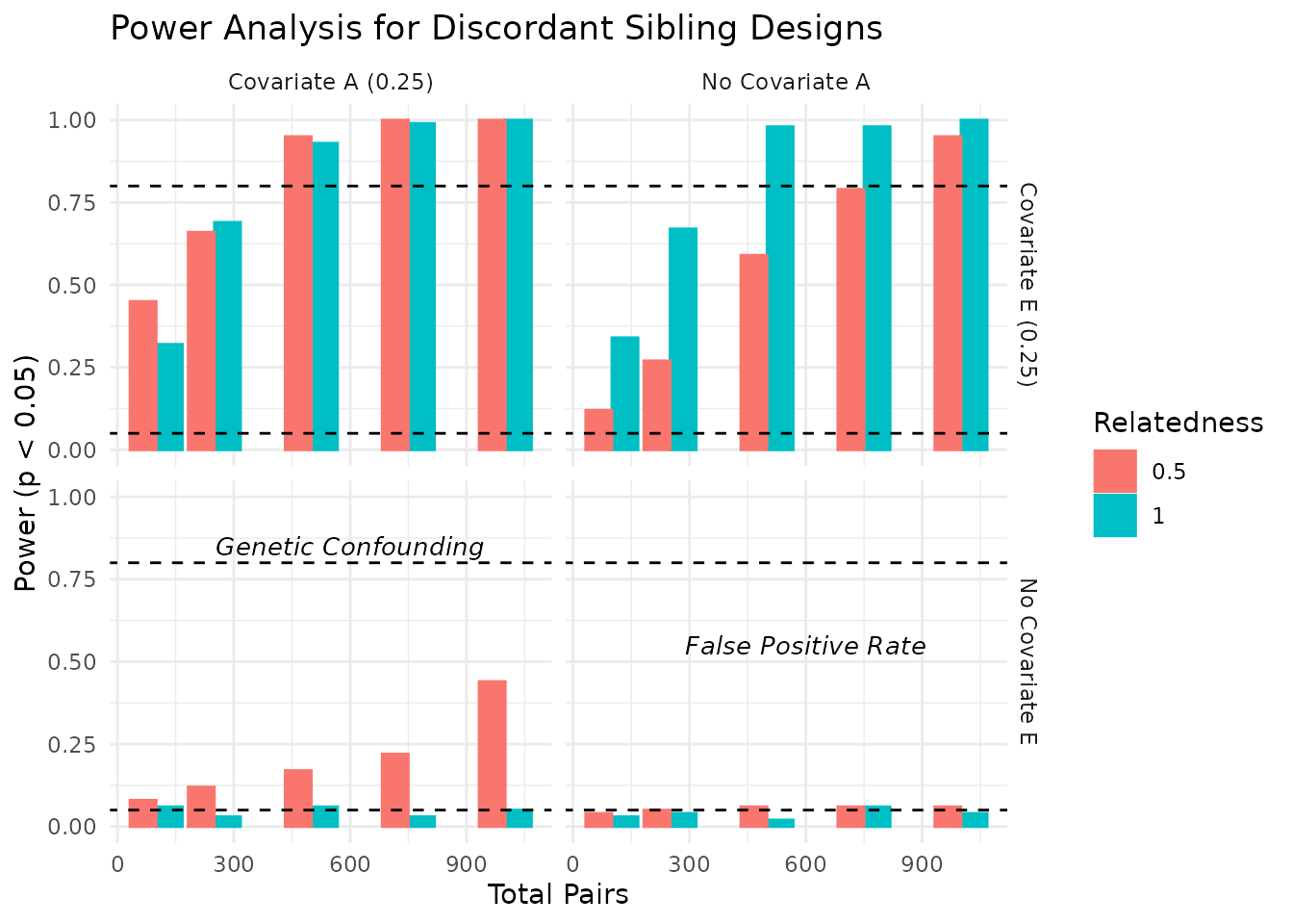 In the plots above, we see how power varies with the number of sibling pairs, relatedness levels, and the presence of covariates. The dashed lines indicate common benchmarks for power (0.80) and false positive rate (0.05). As expected, power increases with the number of pairs and is influenced by the relatedness level and covariate settings.