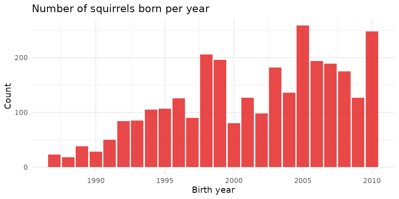 #> # year_first <dbl>, year_last <dbl>The project began marking squirrels in 1987. Birth year coverage shows how the monitored population grew — and which years had the most recruits.