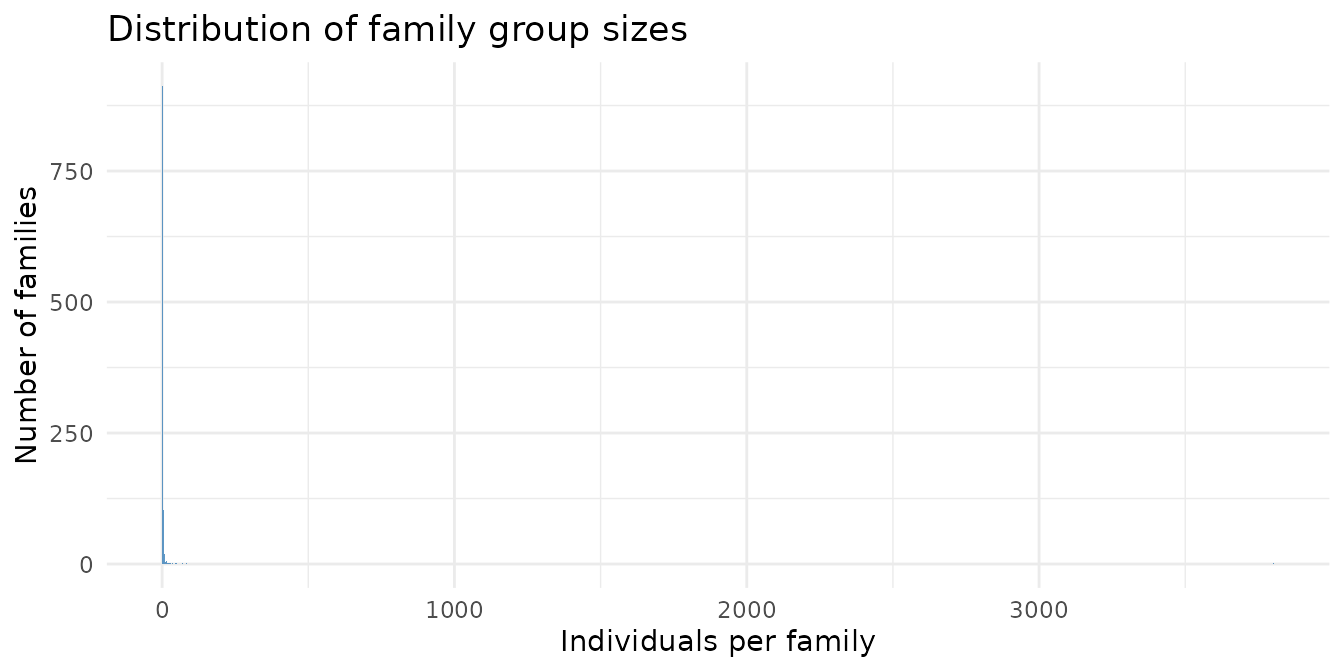 #> Number of families: 1100The dataset includes 1100 distinct family groups. Most are small (wild territorial animals rarely aggregate), but a subset of well-connected lineages spans multiple generations.
