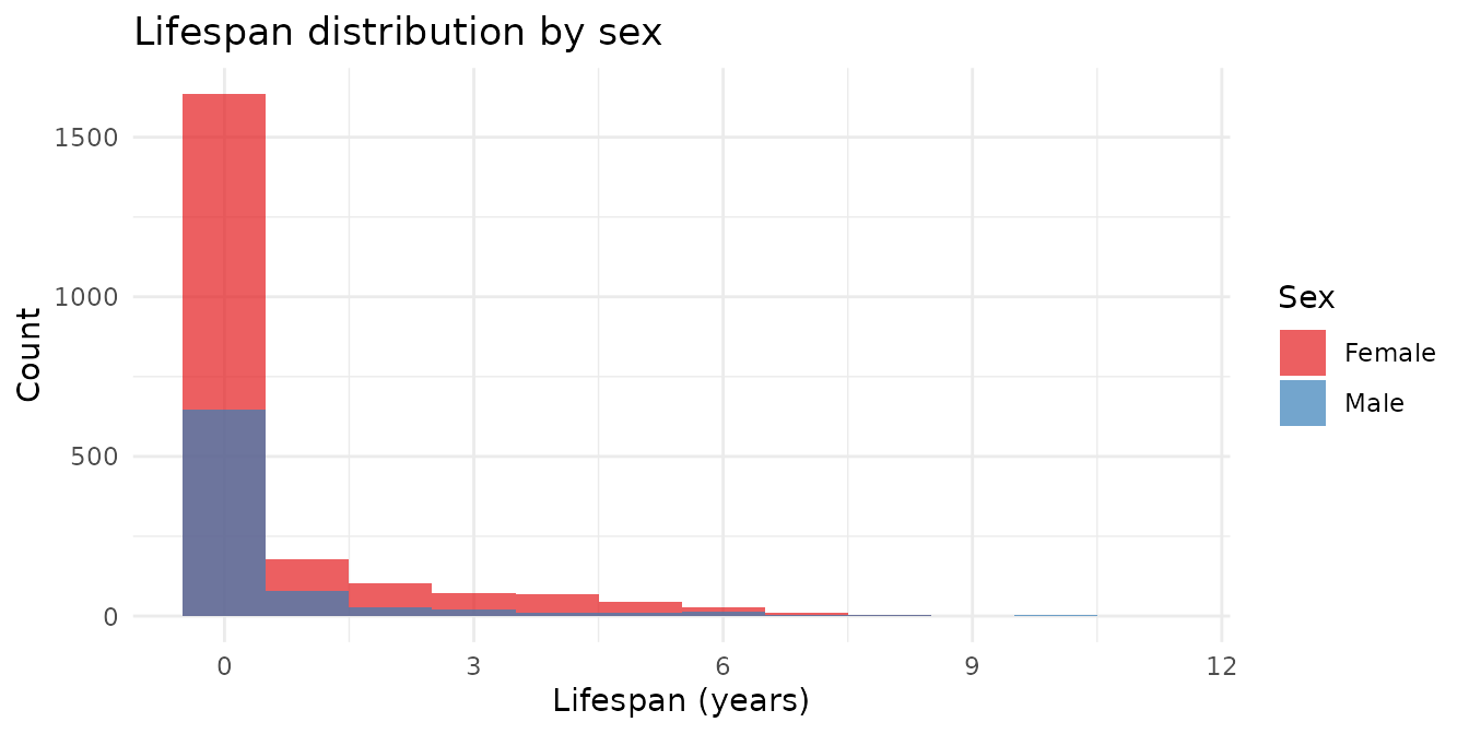 x = "Lifespan (years)", y = "Count", fill = "Sex"
