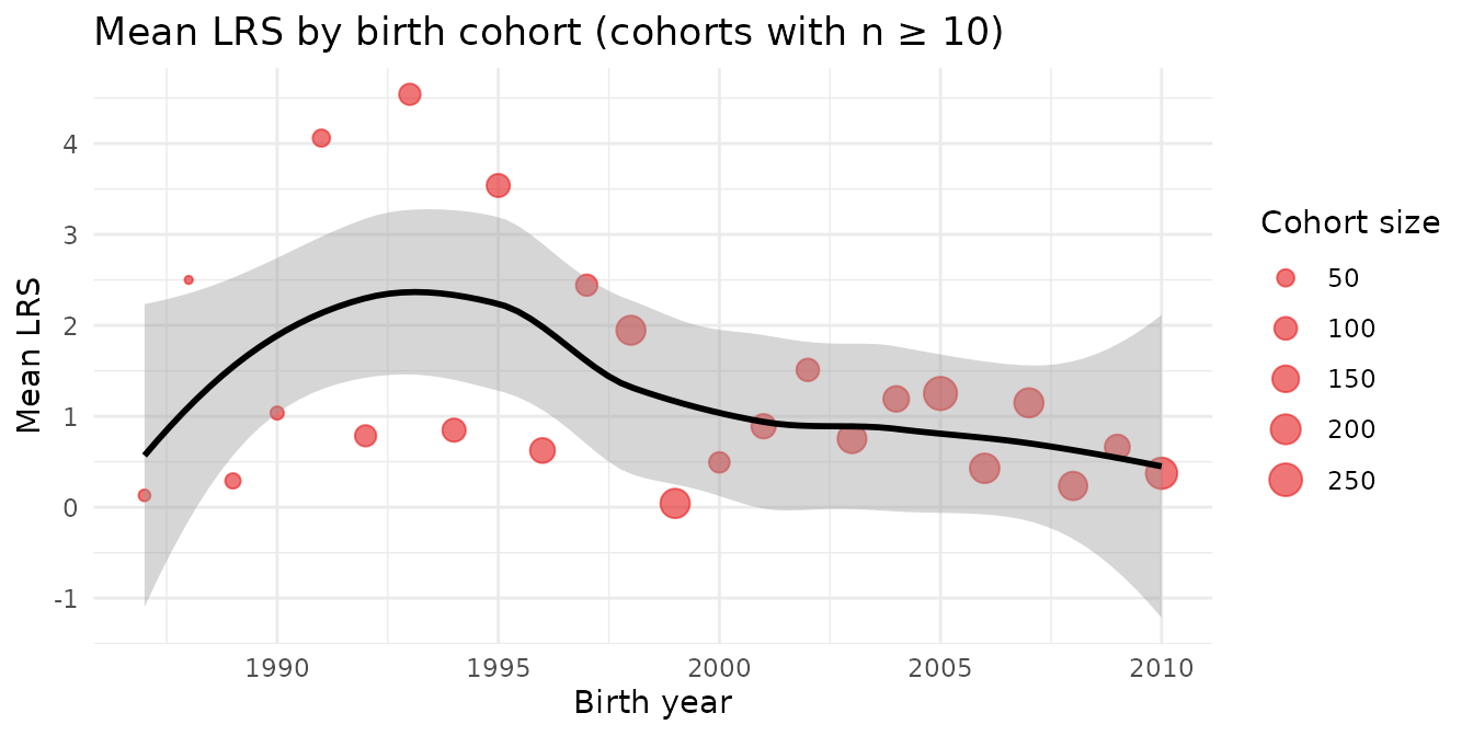 title = "Mean LRS by birth cohort (cohorts with n ≥ 10)",
